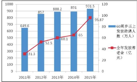 (图为:“十二五”期间全省城乡居民养老金增长情况)