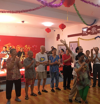 8月9日下午,六对金婚模范夫妻登台,合唱歌曲《月亮代表我的心》。唱到高潮片段,老人们四目相对,传达着几十年来相濡以沫,执子之手,与子偕老的浓浓情意。“和老伴儿结婚61年了,从来没有为她唱过一首情歌,今天也学年轻人时髦一把,让老伴儿开开心心的过节?!?0岁的老人刘杰激动地告诉记者。六对金婚模范夫身后,社区乐队、舞蹈队30余名老人也来“凑热闹”,为他们的老邻居、老朋友伴奏、伴舞,带来七夕节的“礼物”。