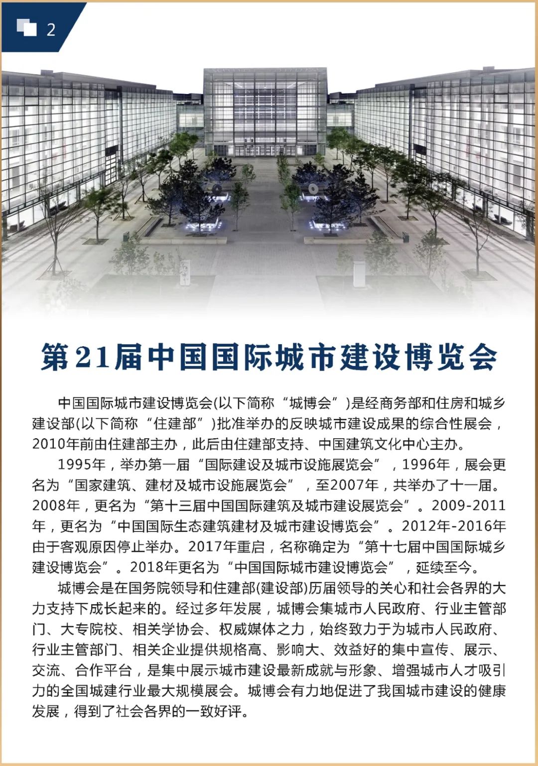 中国国际城市建设博览会(以下简称“城博会”)是经商务部批准、住房和城乡建设部(以下简称“住建部”)支持的反映城市建设成果的综合性展会,由中国建筑文化中心主办。